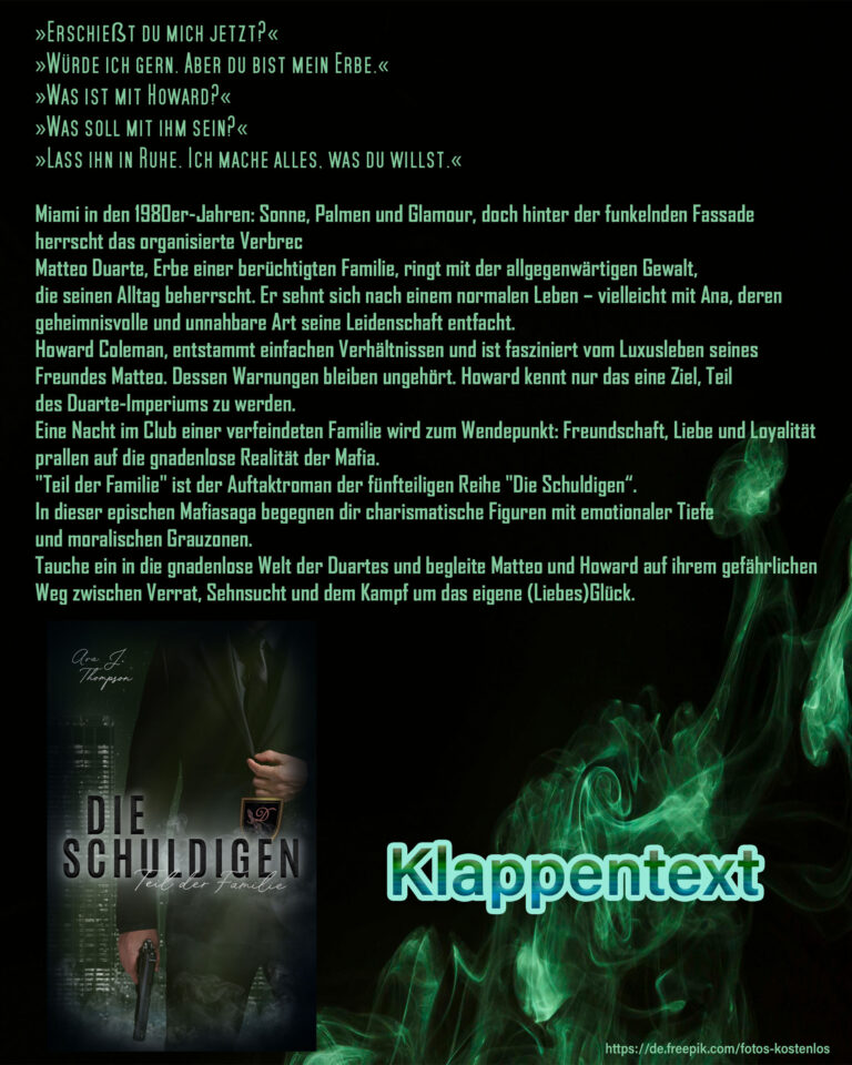 „Mit ››Die Schuldigen‹‹ entführt Ava J. Thompson ihrer Leserschaft mitten ins glühende Miami der 80er-Jahre – eine Stadt voller Kontraste, in der Sonnenschein und Palmen nur Fassade für ein unsichtbares Machtgeflecht sind. Hinter den Kulissen tobt ein Kampf zwischen rivalisierenden Mafia-Clans, in dem Loyalität und Macht Fragen von Leben und Tod sind. …